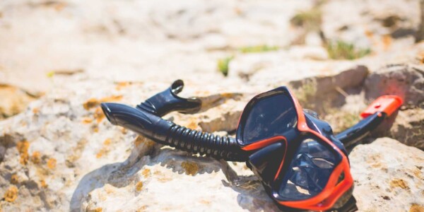 Snorkel and Diving Scuba Mask On a Rock Near The Sea