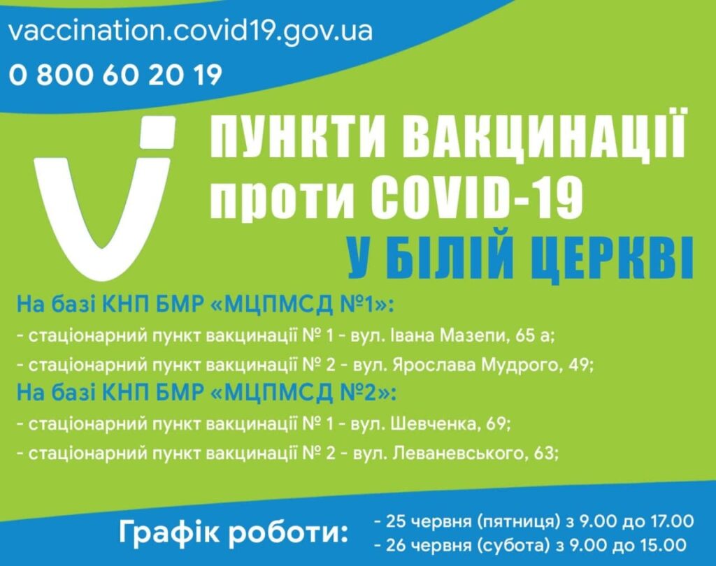 Біла Церква – БЕЗ ТАБУ > Останні публікації > Коронавірус online > 25-26 червня у Білій Церкві можна буде вакцинуватись: адреса, графік роботи