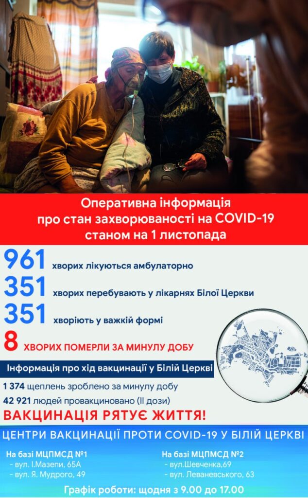 Оперативна інформація про стан захворюваності на COVID-19 станом на 1 листопада, за інформацією Білоцерківської МТГ: