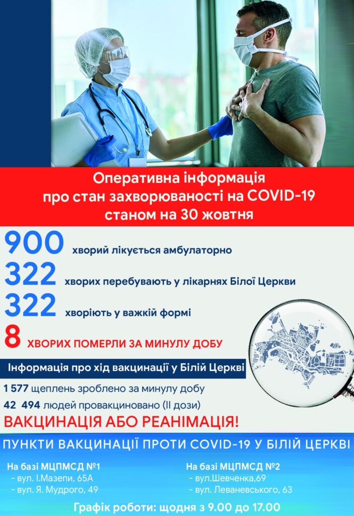Оперативна інформація про стан захворюваності на COVID-19 станом на 30 жовтня, за інформацією Білоцерківської МТГ: