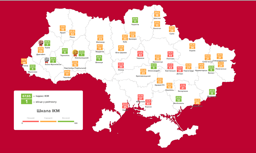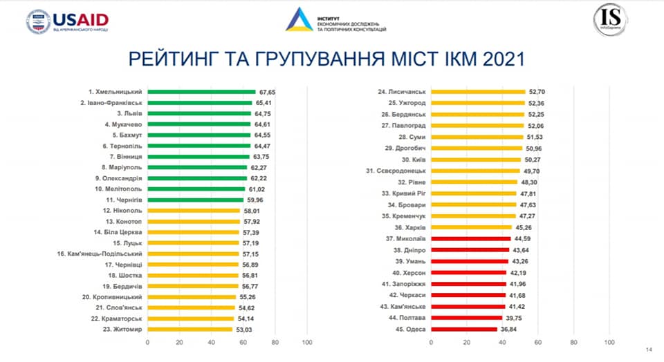 Програма Агентства США з міжнародного розвитку (USAID) «Конкурентоспроможна економіка України», у партнерстві з компанією Інфо Сапієнс та Інститутом економічних досліджень та політичних консультацій представили результати другого Індексу конкурентоспроможності міст (ІКМ), на основі якого створено рейтинг 45-ти найбільших міст України за якістю ділового середовища.