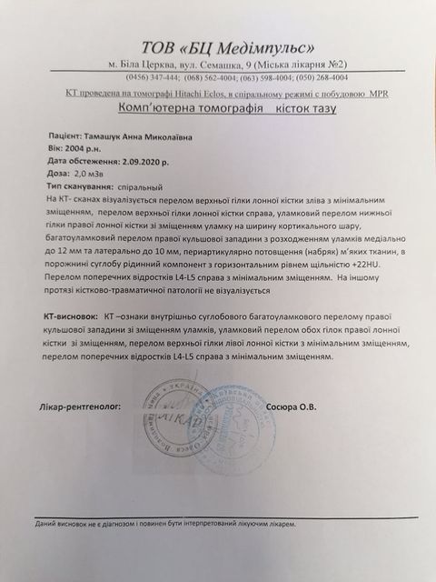 Дівчина отримала множинні переломи і травми: переломи тазових кісток, роздроблений тазовий суглоб, перелом ключиці, перелом щелепи.