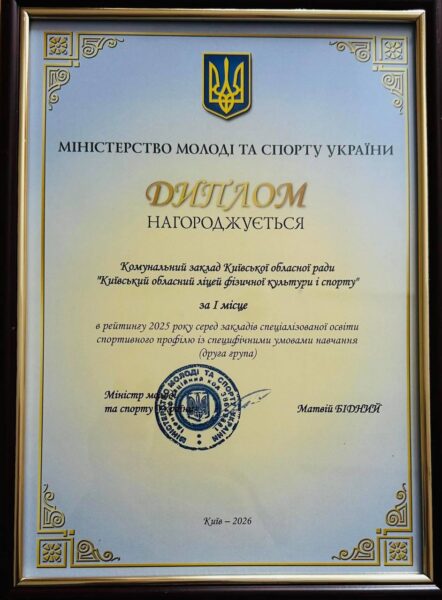 За підсумками 2025 року КЗ КОР «Київський обласний ліцей фізичної культури і спорту» (м. Біла Церква) очолив національний рейтинг серед закладів спеціалізованої освіти спортивного профілю зі специфічними умовами навчання. Відповідний наказ Міністерства молоді та спорту України №844 підписано 13 лютого 2026 року.