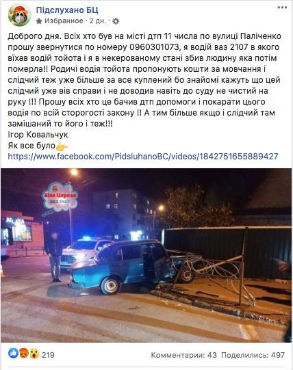 Раніше водій автомобіля ВАЗ звернувся до білоцерківців на сторінках Підслухано БЦ з проханням поширити інформацію щодо пошуку свідків, щоб слідчий не “зам’яв справу” і водій Toyota поніс покарання.