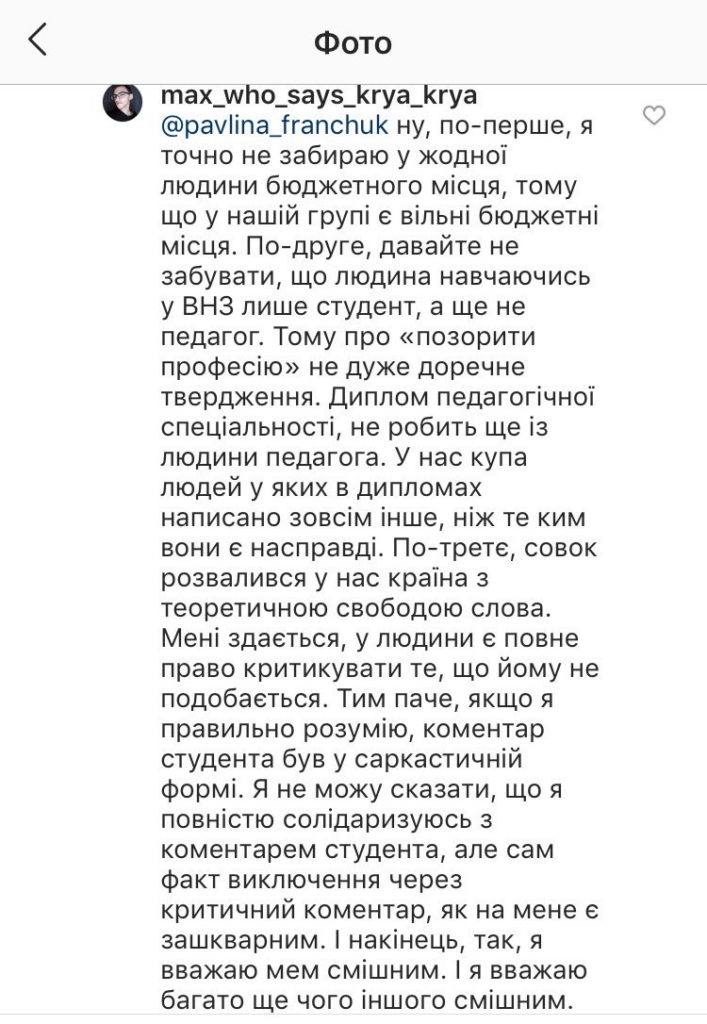 11 грудня було відраховано студента 23 поф. групи педагогічного колледжуза коментар під постом в Instagram.