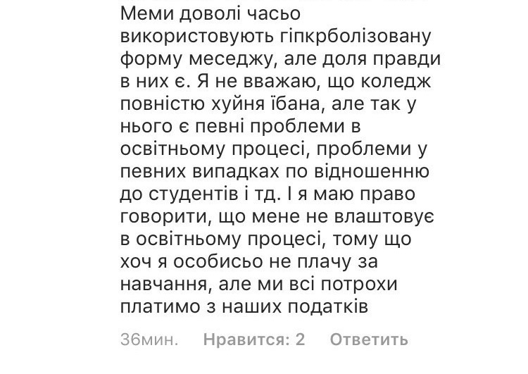 Пост жорстко і агресивно висміює цей навчальний заклад, і відрахований Владислав (@fading_hell) вирішив підтримати авторів цього запису та в подібній манері висловитися щодо директора та навчального закладу.