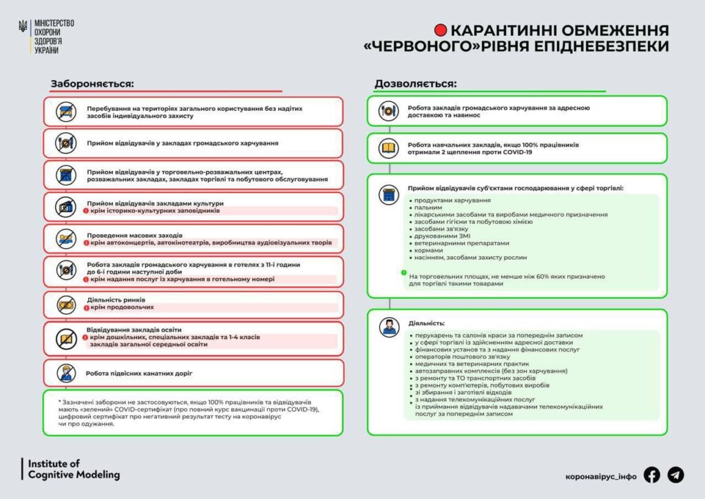 У “червоних” зонах поширення коронавірусу забороняється робота закладів громадського харчування, ТРЦ, непродовольчих ринків та магазинів, проведення масових заходів тощо.