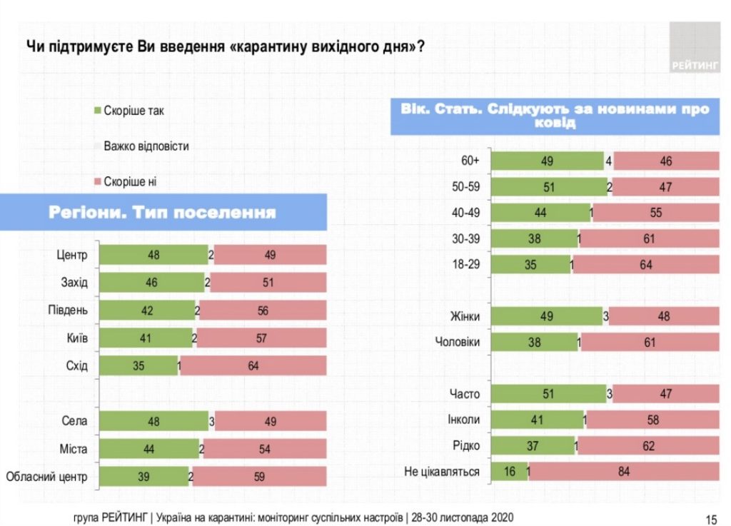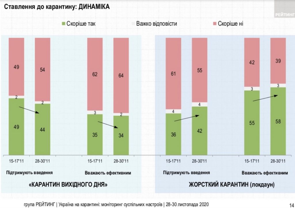 Вказується, що протягом останніх двох тижнів рівень підтримки карантину вихідного дня зменшився з 49 до 44% (кількість противників зросла з 49 до 54%). Лише 34% українців очікують, що внаслідок його запровадження зменшиться поширення коронавірусу, натомість 64% – не погоджуються з цим.