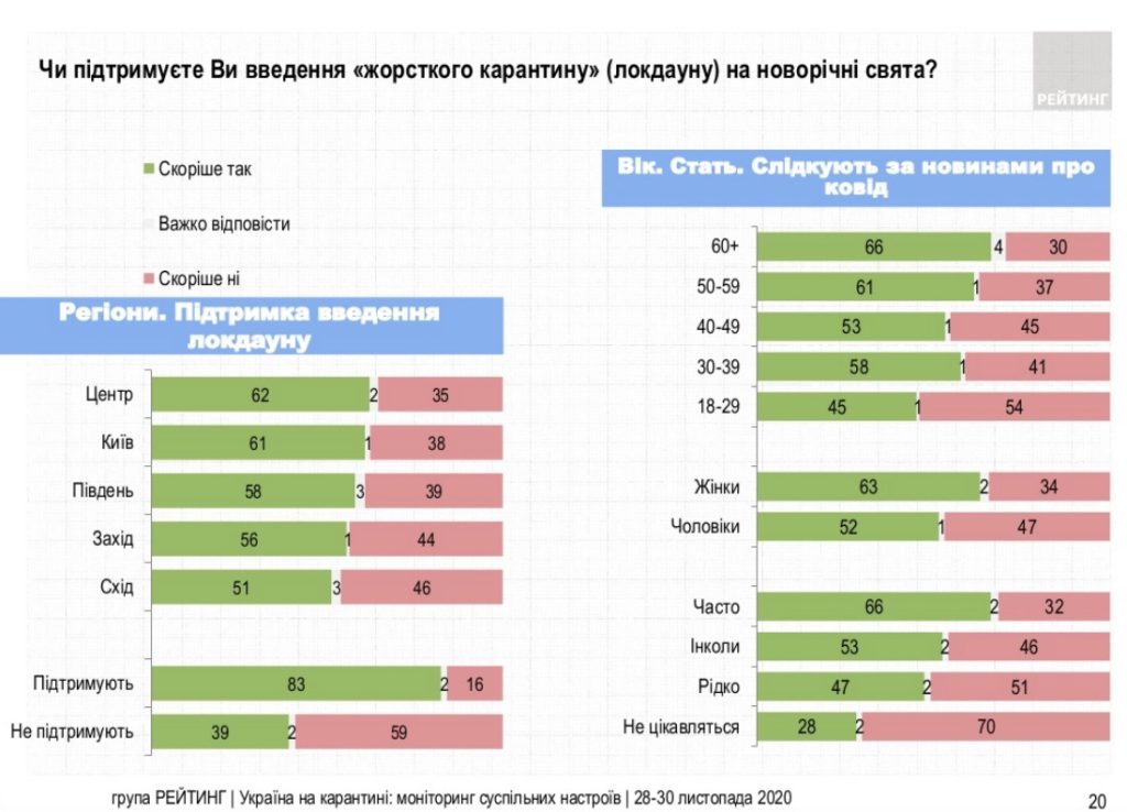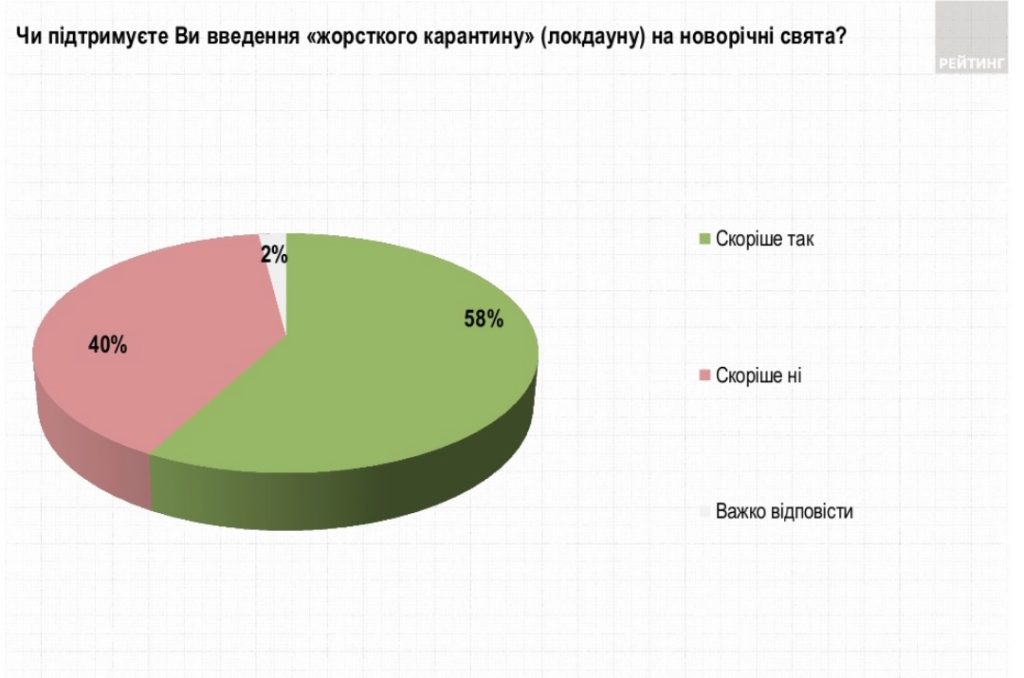 Водночас, підтримка запровадження «жорсткого карантину» (локдауну) зросла з 36 до 42% (кількість противників зменшилась з 61 до 55%). Аналогічно, зросла кількість респондентів (з 55 до 58%), які вважають, що поширення коронавірусу внаслідок локдауну зменшиться. При цьому, 58% опитаних підтримують введення локдауну на новорічні свята (40% – проти цього).