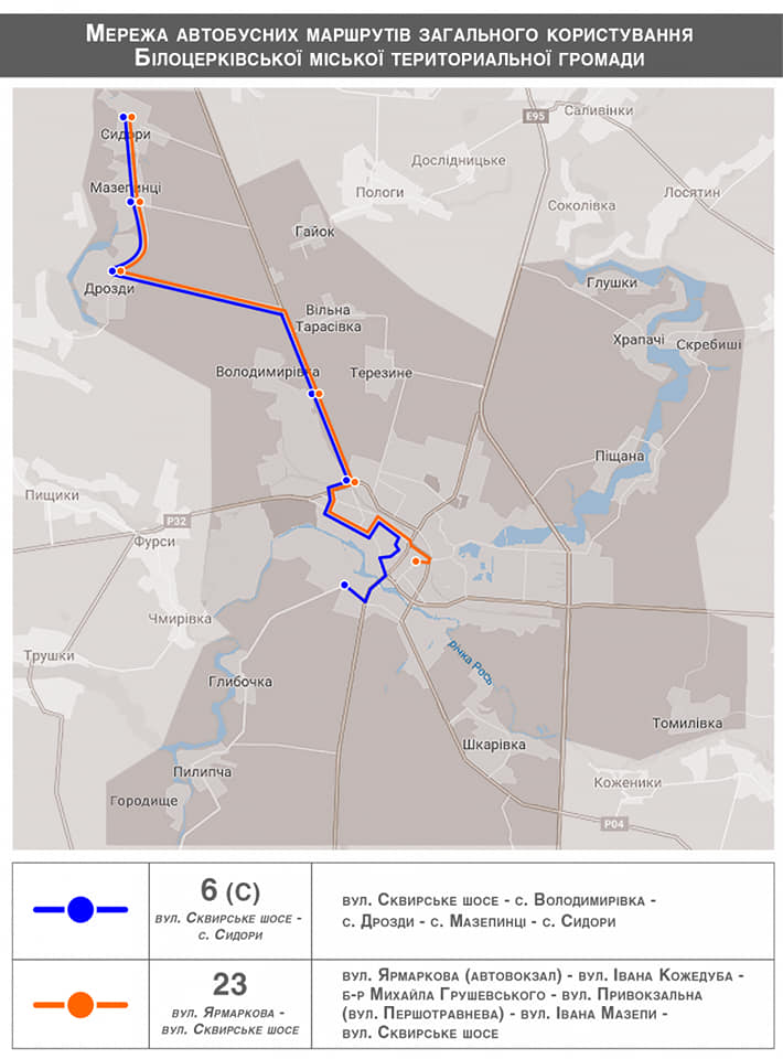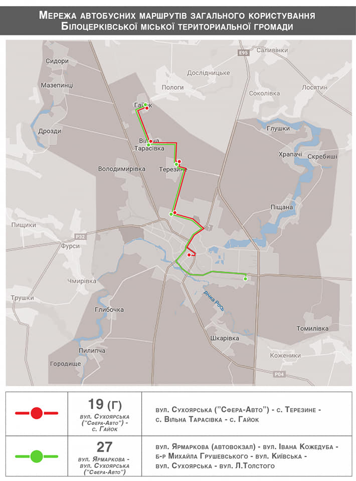 № 23 «вул. Ярмаркова – вул. Сквирське шосе», №19 (Г) «вул. Сухоярська («Сфера Авто») – с. Гайок» (с. Терезине – с. Вільна Тарасівка),
