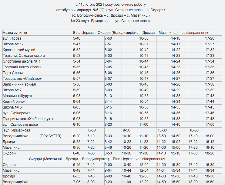 №6 (С) «вул. Сквирське шосе – с. Сидори» (с. Володимирівка – с. Дрозди – с. Мазепинці),