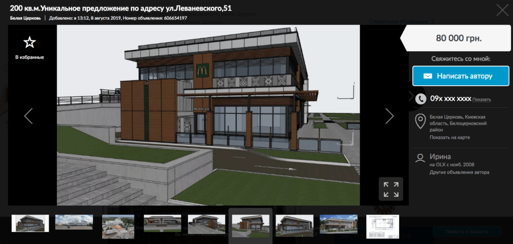“Дуже вигідне і перспективне місце, жвавий пішохідний трафік. На першому поверсі розташований MacDonald’s. Будівля примикає до ДК Росава, поруч 2 парки“, – зазначено в оголошенні.
