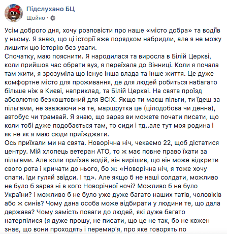 “Ось приїхали ми на свята. Новорічна ніч, чекаємо 22, щоб дістатися центру. Мій хлопець ветеран АТО, то ж має повне право їхати за пільгами. Але коли приїхав водій, він вирішив, що він може відкрити свого рота і кричати до нього, бо ж: «Новорічна ніч, я тоже хочу спати. Іди гуляй звідси. І тд». Але якщо б не наші солдати, можливо не було б зараз ні в кого Новорічної ночі? Можливо б не було України? І можливо б не було уже дуже багато наших татів, чоловіків або ж синів?
