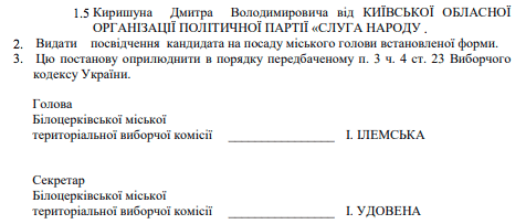 - Киришун Дмитро Володимирович від КИЇВСЬКОЇ ОБЛАСНОЇ ОРГАНІЗАЦІЇ ПОЛІТИЧНОЇ ПАРТІЇ «СЛУГА НАРОДУ.