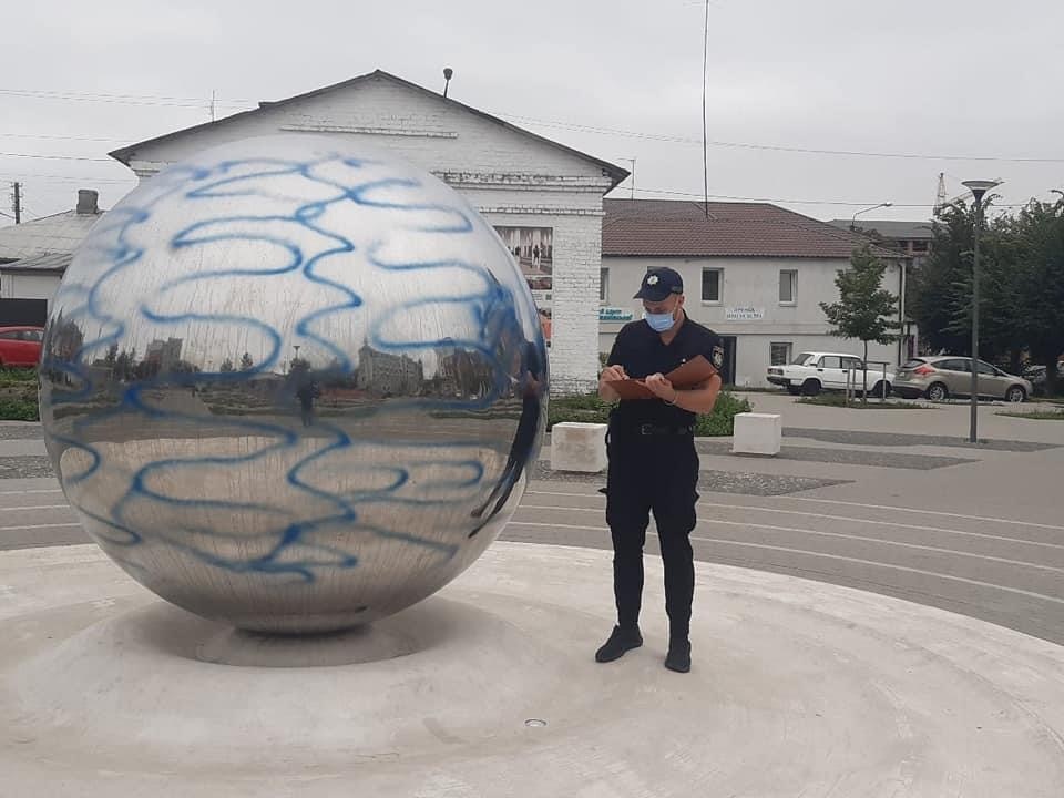 Поліцейські з’ясували, що правопорушник розмалював дзеркальну кулю – Пам’ятник Героям боротьби за Незалежність України, після чого з місця події зник на автомобілі “BMW”. За лічені хвилини поліцейські батальону патрульної поліції затримали лиходія за місцем проживання та доставили на місце скоєного ним правопорушення.