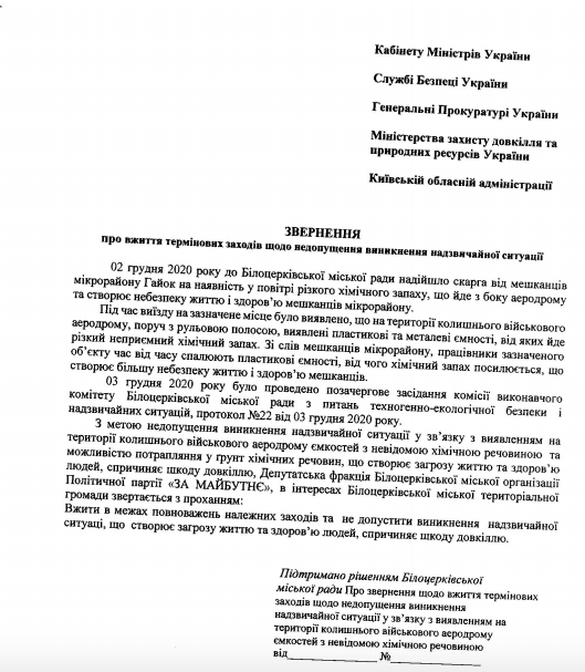 Відповідне звернення вони відправлять до Кабінету Міністрів України, Служби Безпеки України, Генеральної Прокуратури України, Міністерства Захисту Довкілля та природніх ресурсів України, Київської обласної адміністраціЇ.