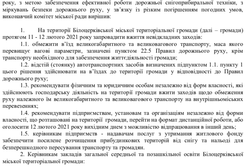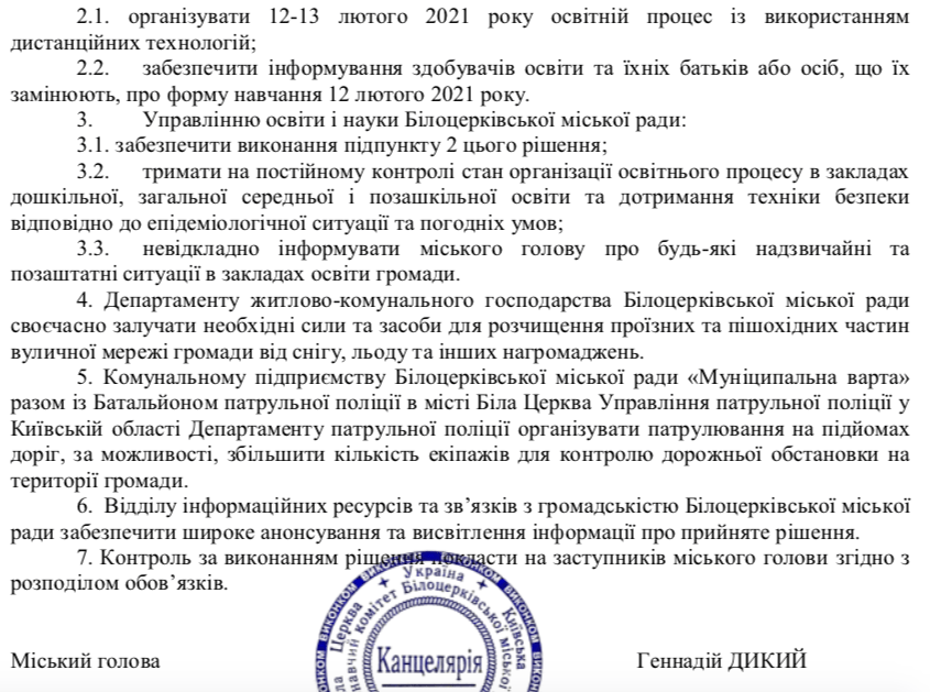 У найближчі два дні погодні умови в Білій Церкві погіршаться, кількість опадів збільшиться. У зв’язку з цим заклади загальної середньої та позашкільної освіти Білоцерківської міської територіальної громади 12-13 лютого проводитимуть свій освітній процес із використанням дистанційних технологій.