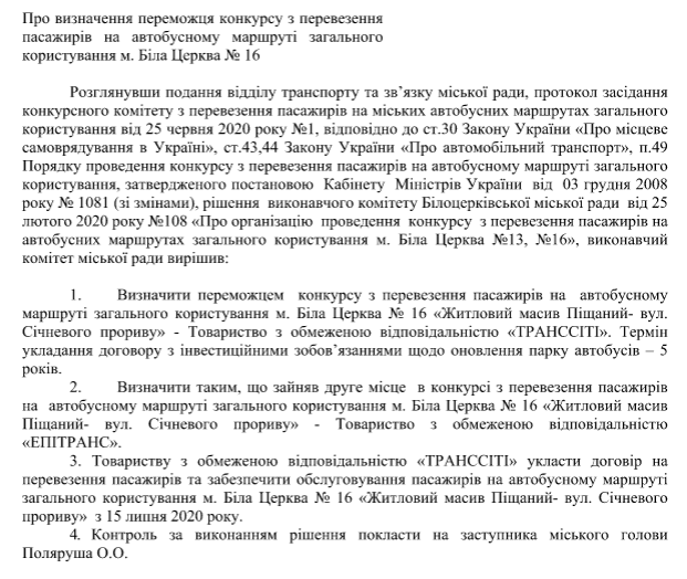 16 липня на засіданні виконавчого комітету Білої Церкви було оголошено переможця конкурсу серед перевізників на маршрути №13 та №16.