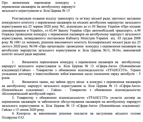 Переможцем конкурсу з перевезення пасажирів на автобусному маршруті загального користування м. Біла Церква № 13 «Сфера-Авто» (Новокиївське кладовище)-Гайок» – було визначено Товариство з обмеженою відповідальністю «ТРАНССІТІ». Термін укладання договору з інвестиційними зобов’язаннями щодо оновлення парку автобусів – 5 років.