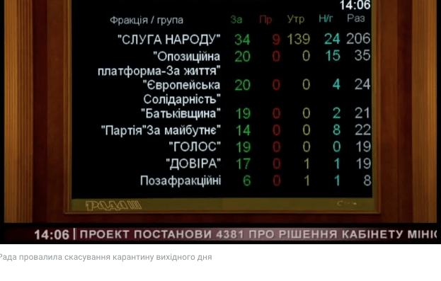 У Верховній Раді провалили голосування за проєкт постанови про скасування карантину вихідного дня.