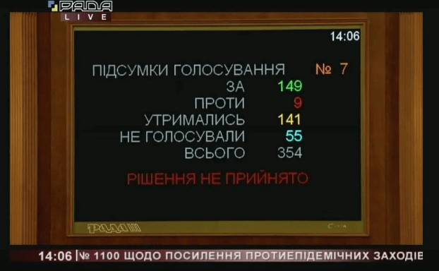 За документ №4381 “Про рішення Кабінету Міністрів України від 11 листопада 2020 року №1100 про посилення протиепідемічних заходів” проголосували лише 149 нардепів.