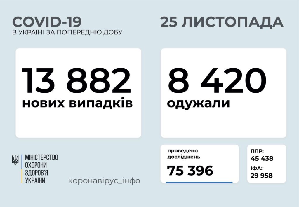 За минулу добу коронавірус в Україні виявили у 13 882 осіб, зафіксовано 229 летальних випадків, 8420 пацієнтів одужали.