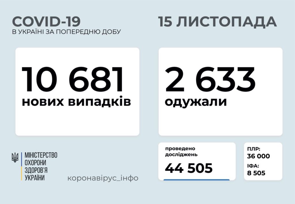 За минулу добу коронавірус в Україні виявили у 10 681 людини, зафіксовано 95 летальних випадків, 2 633 пацієнти одужали.