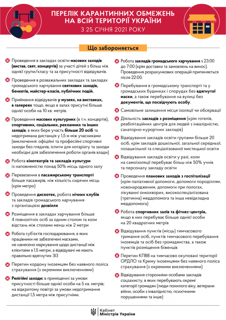 З 25 січня по 28 лютого в Україні діятимуть карантинні обмеження “помаранчевої” зони, а також додаткові обмеження, запроваджені у грудні.