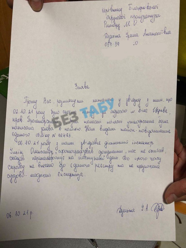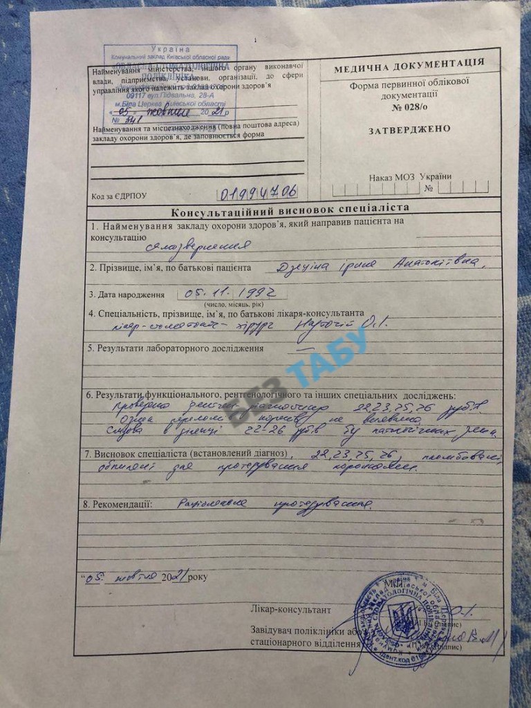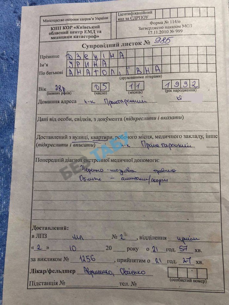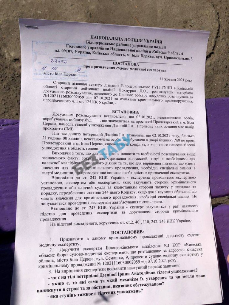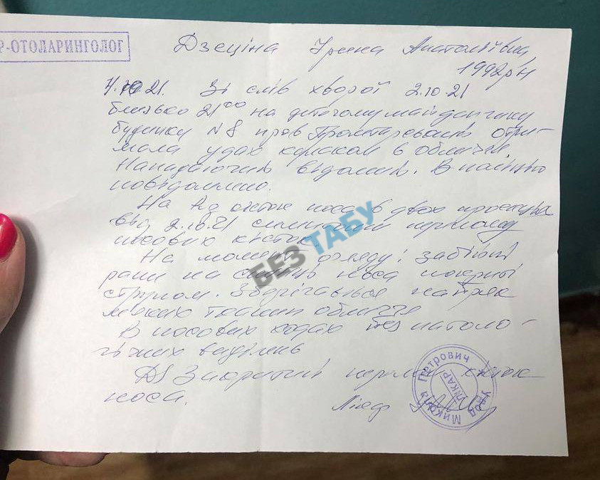 Постраждала Ірина Дзеціна аж на 9 добу після інциденту змогла отримати направлення на судово–медичну експертизу.