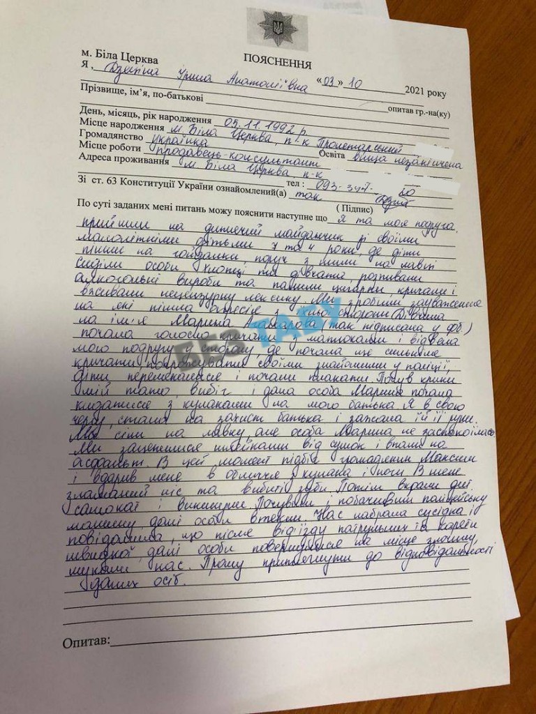 “В цей час батько забрав діток і повів до нас додому, поки ми залишилися чекати на поліцейських. Дівчина в цей час кричала, наче її там вбивали, хоча її ніхто не бив, а я просто тримала, щоб не втекла. За цей час поліцейські ще не приїхали… Дівчина вкусила мене за ліву руку і якимось чином моя сумка, яка була через плече, зачепилася за її ланцюжок, який був на її шиї, знає напевно один Бог.