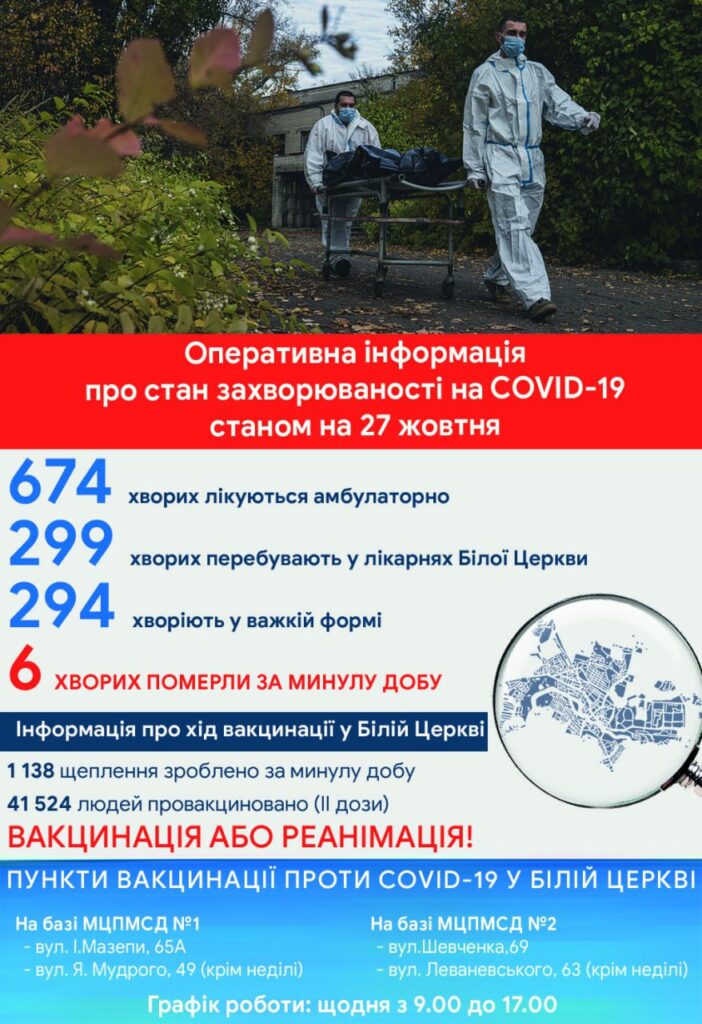 Оперативна інформація про стан захворюваності на COVID-19 станом на 27 жовтня, за інформацією Білоцерківської МТГ: