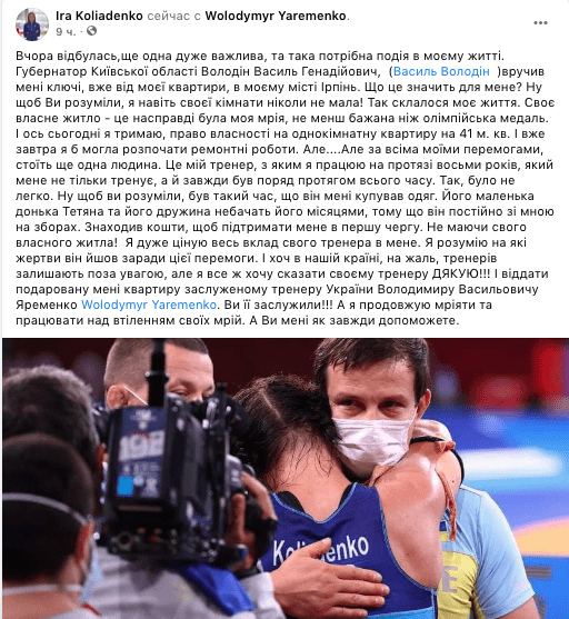 “Сьогодні я тримаю право власності на однокімнатну квартиру на 41 кв. м. у рідному Ірпені. І вже завтра я могла почати ремонтні роботи. Але… За всіма моїми перемогами стоїть ще одна людина. Це мій тренер, з яким я працюю упродовж восьми років, який мене не тільки тренує, а й завжди був поруч протягом усього часу. Щоб ви розуміли, був такий час, що він мені купував одяг. Знаходив кошти, щоб підтримати мене в першу чергу. Не маючи власного житла!” – написала спортсменка.