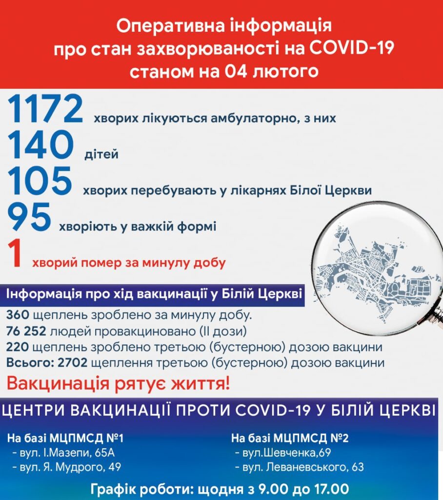 Оперативна інформація про стан захворюваності на COVID-19 станом на 4 лютого, за інформацією Білоцерківської МТГ: