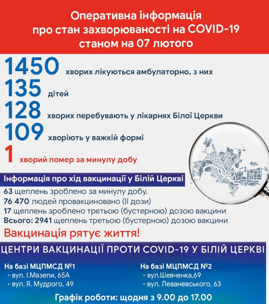 Оперативна інформація про стан захворюваності на COVID-19 станом на 7 лютого, за інформацією Білоцерківської МТГ:
