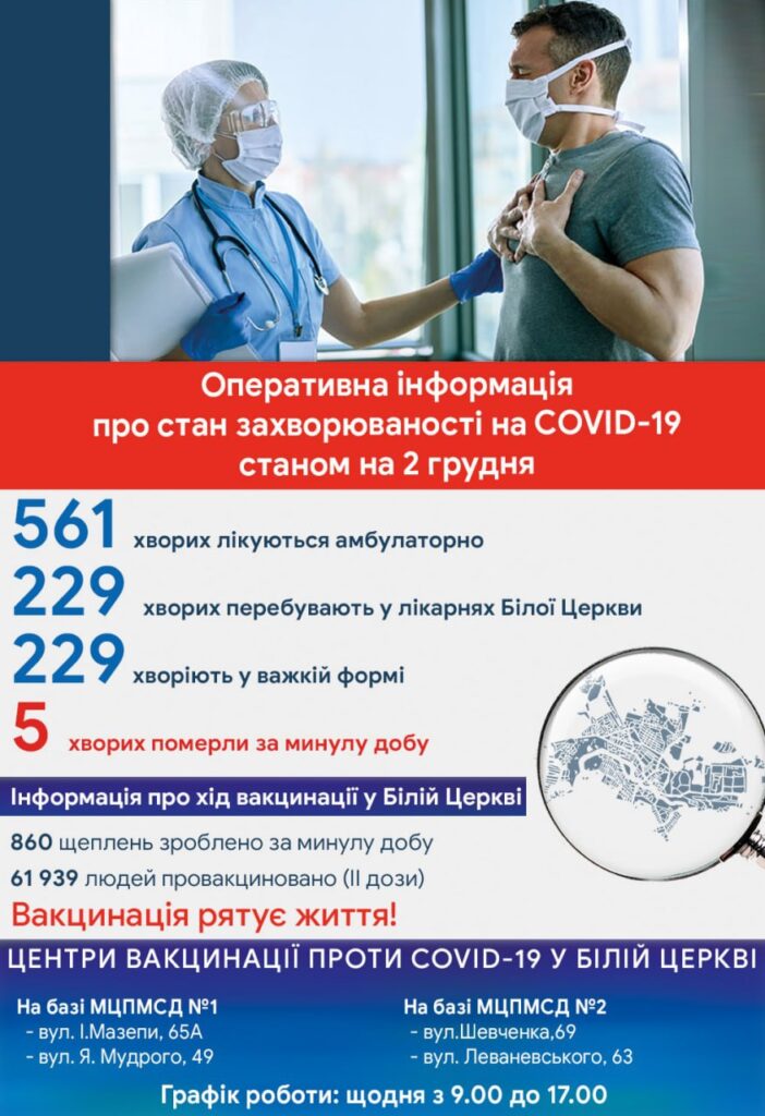 Оперативна інформація про стан захворюваності на COVID-19 станом на 2 грудня, за інформацією Білоцерківської МТГ: