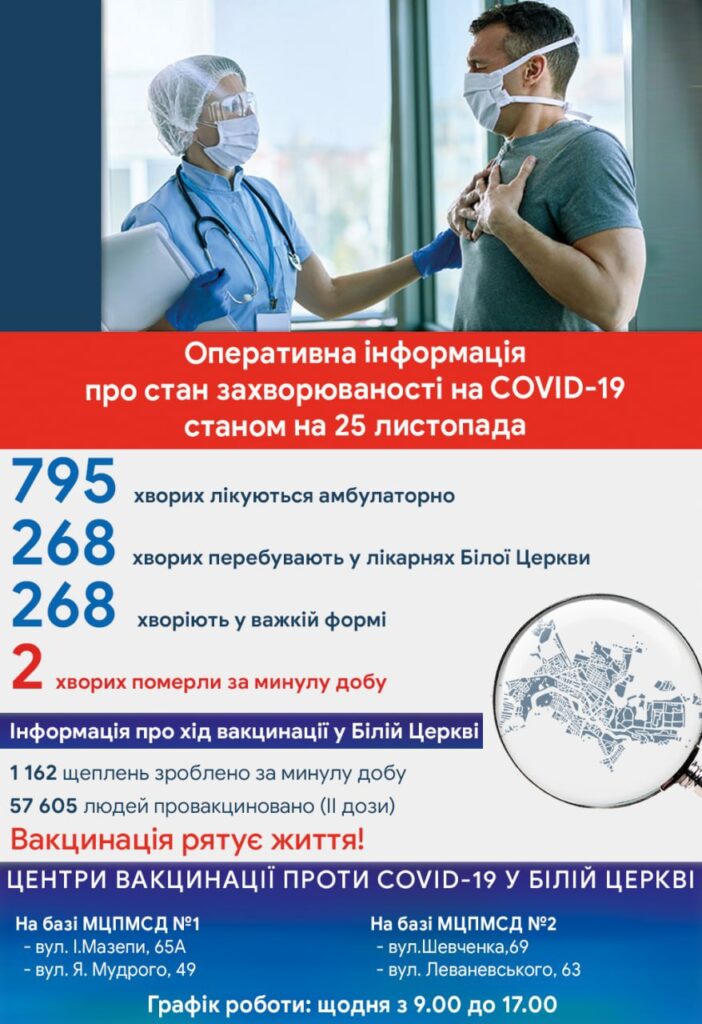 Оперативна інформація про стан захворюваності на COVID-19 станом на 25 листопада, за інформацією Білоцерківської МТГ: