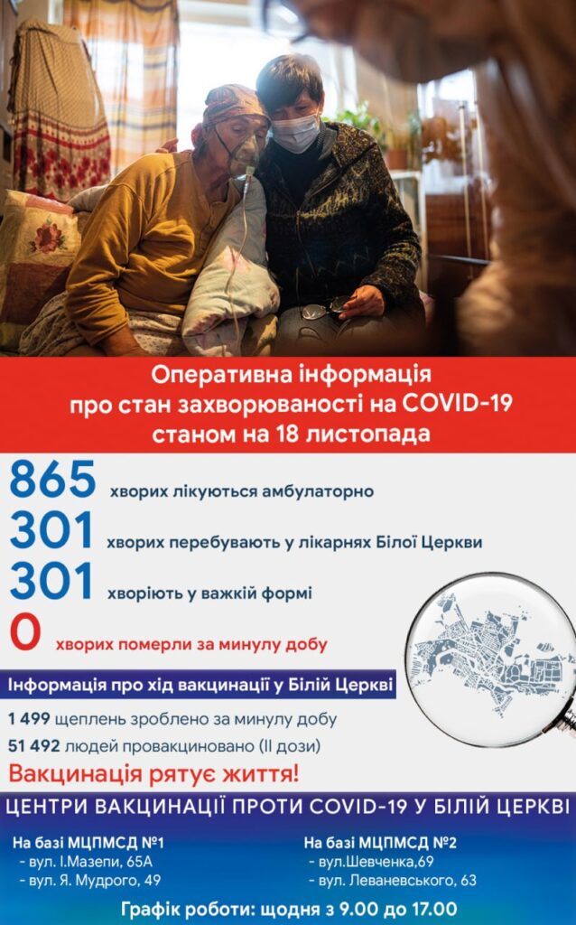 Оперативна інформація про стан захворюваності на COVID-19 станом на 18 листопада, за інформацією Білоцерківської МТГ: