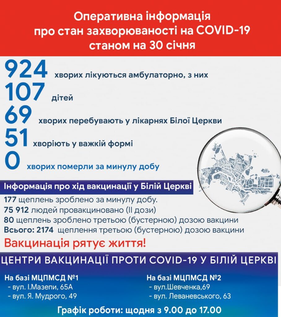 Оперативна інформація про стан захворюваності на COVID-19 станом на 30 січня, за інформацією Білоцерківської МТГ: