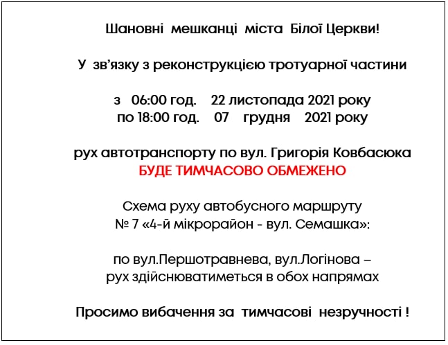 Біла Церква – БЕЗ ТАБУ > Останні публікації > Новини > У Білій Церкві буде перекрито рух транспорту по вул. Григорія Ковбасюка до 7 грудня