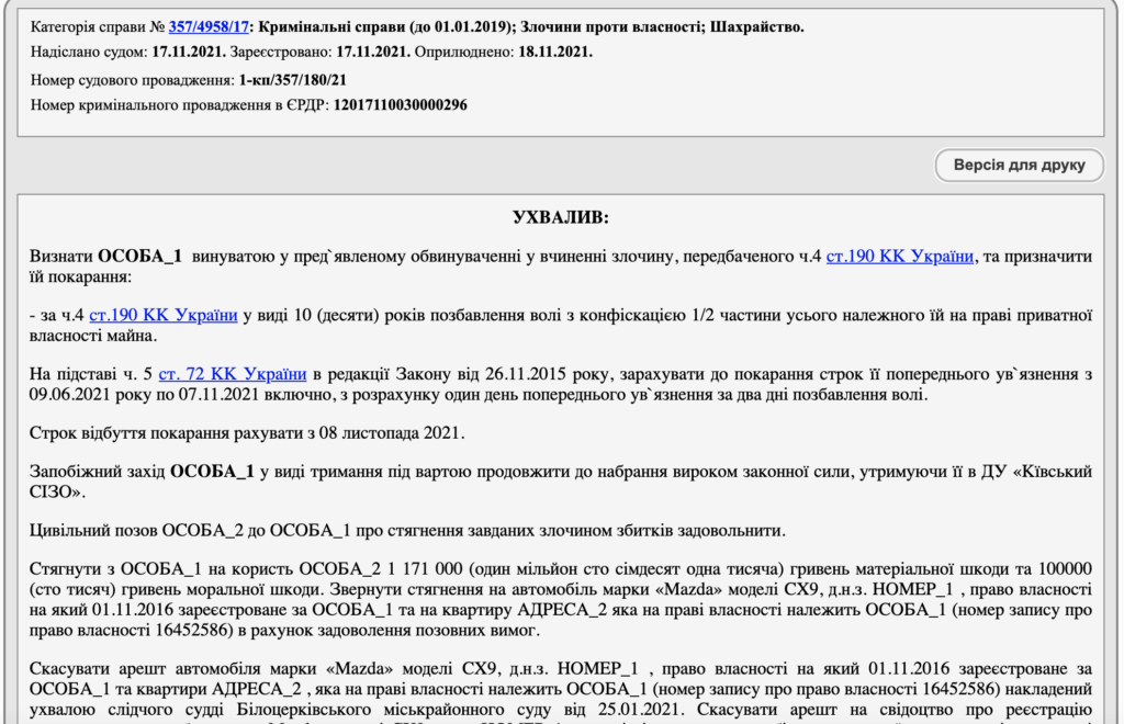 Вироком суду шахрайку ув’язнено на 10 років. 3 неї стягнуто на користь потерпілої 1 мільйон 171 тисячу гривень матеріальної та 100 тисяч гривень моральної шкоди.