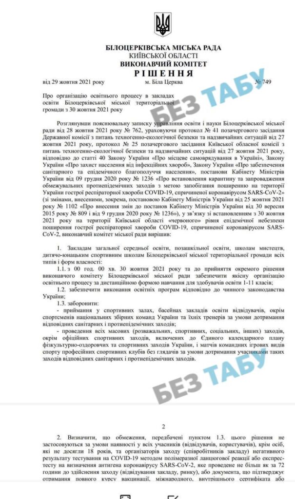 Закладам загальної середньої освіти, позашкільної освіти, школам мистецтв, дитячо-юнацьким спортивним школам Білоцерківської міської територіальної громади всіх типів і форм власності: з 00 год. 00 хв. 30 жовтня 2021 року та до прийняття окремого рішення виконавчого комітету Білоцерківської міської ради забезпечити якісну організацію освітнього процесу за дистанційною формою навчання для здобувачів освіти 1-11 класів.