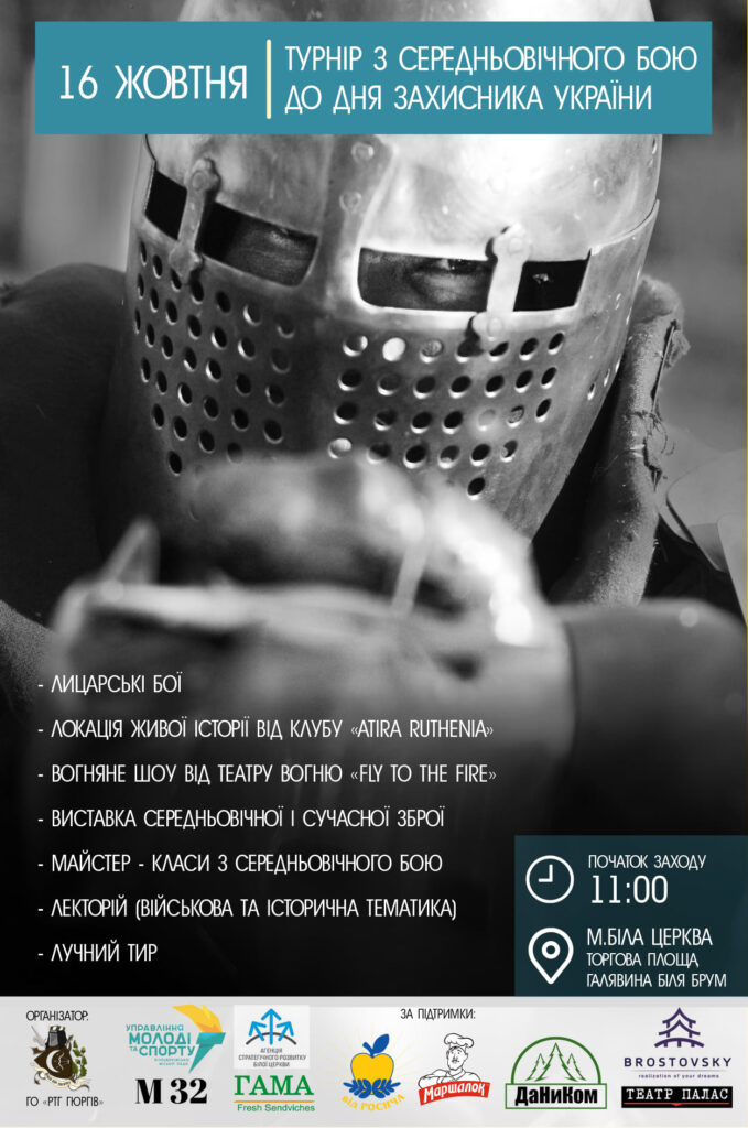 16 жовтня о 10:30 на Торговій площі біля БРУМу розпочнеться турнір з середньовічного бою до Дня захисника України. Лицарі, запеклі бої, історична середньовічна локація, виставка середньовічної та сучасної зброї , захоплююче тематичне вогняне шоу – все це чекатиме на гостей заходу. Будуть діяти локації як для дорослих, так і для дітей.