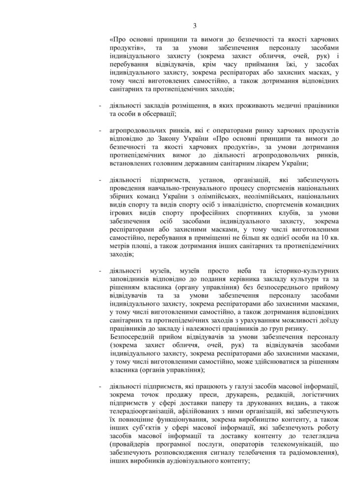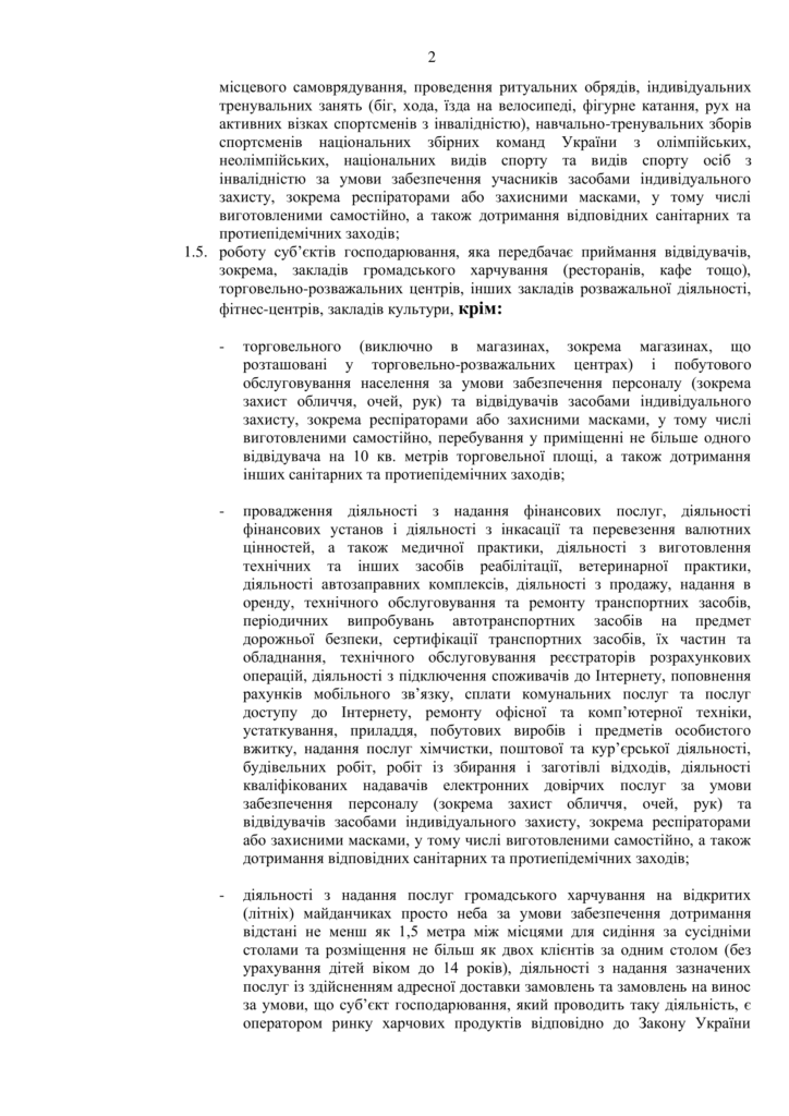 Дозволено діяльність підприємств, установ, організацій, які забезпечують проведення навчально-тренувального процесу спортсменів національних збірних команд України з олімпійських, неолімпійських, національних видів спорту та видів спорту осіб з інвалідністю тощо за умови забезпечення осіб засобами індивідуального захисту, перебування в приміщенні не більш як однієї особи на 10 кв. метрів площі та дотримання інших санітарних та протиепідемічних заходів.