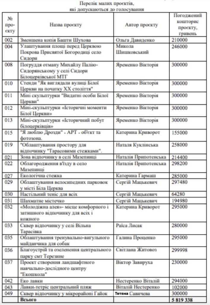 Затверджені й 23 малих проєктів (кошторис до 300 тис. грн), за які матимуть можливість голосувати жителі Білоцерківської МТГ.