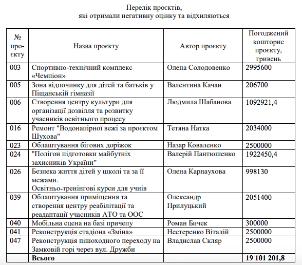 Визначено й перелік проєктів, які отримали негативну оцінку та відхиляються. Таких 12 проєктів.