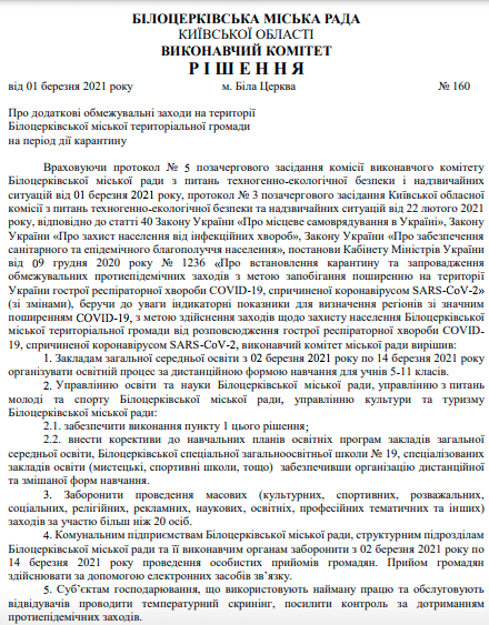 Через суттєве зростання захворюваності на коронавірус у Білій Церкві із вівторка, 2 березня, в усіх школах учні 5-11 класів навчатимуться дистанційно. Дистанційне начання триватиме до 14 березня.