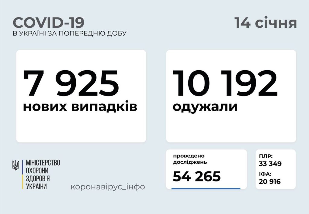 За минулу добу коронавірус в Україні виявили у 7925 осіб, зафіксовано 162 летальних випадки, 10 192 пацієнта одужали.