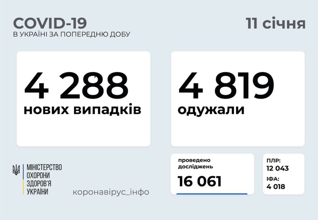 Про це свідчать дані Міністерства охорони здоров’я станом на ранок понеділка, 11 січня.