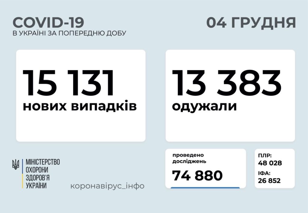 За минулу добу коронавірус в Україні виявили у 15 131 особи, зафіксовано 235 летальних випадків, 13 383 пацієнта одужали.