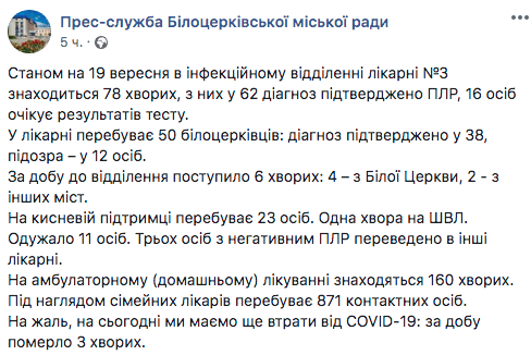 У інфекційному відділенні лікарні №3 знаходиться 78 хворих, з них у 62 діагноз підтверджено ПЛР, 16 осіб очікує результатів тесту, 3 осіб померло.